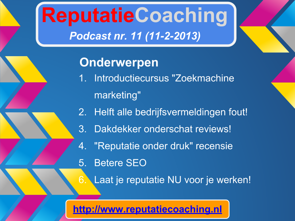 Voor deze podcast heb ik verder weer een aantal leuke onderwerpen. Als eerste kom ik nog terug met een recent praktijkvoorbeeld over iets wat ik in podcast 9 heb verteld. Ten tweede de ervaring die een luisteraar van deze podcast had op basis van de tips en trucs aangaande reputatie etc. Dan de recensie die contentmarketing spreker Arend Landman schreef over boek “Reputatie onder druk” dat is geschreven door Frank Peters. Als vierde onderwerp vertel ik deze podcast dan toch echt over de introductiecursus “Zoekmachine marketing” en ik sluit vandaag af met een aantal adviezen over hoe je per direct een stuk beter kunt zijn in alles wat je doet, hetgeen dus ook weer helpt bij de reputatie.