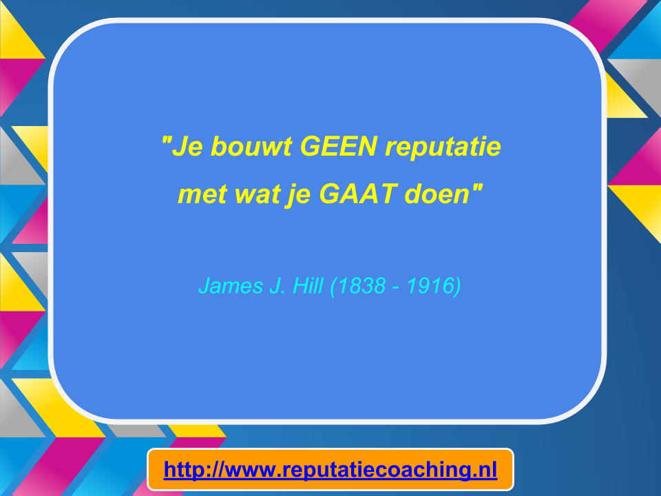 Arend Landman, een trouwe luisteraar van mijn podcast wiens naam vandaag al eerder voorbij is gekomen, wees mij op een fundamentele fout in de afsluiting van de podcast. Ik zeg elke keer aan het einde van de podcast, dat je nu aan je reputatie moet werken, zodat je reputatie LATER voor jou kan werken. Dit suggereert volgens hem dat je eerst in figuurlijke zin krom moet liggen zonder enig positief resultaat en dat je maar moet geloven en hopen dat je reputatie in de verre toekomst ooit eens voor je zal gaan werken en een positieve bijdrage zal leveren.