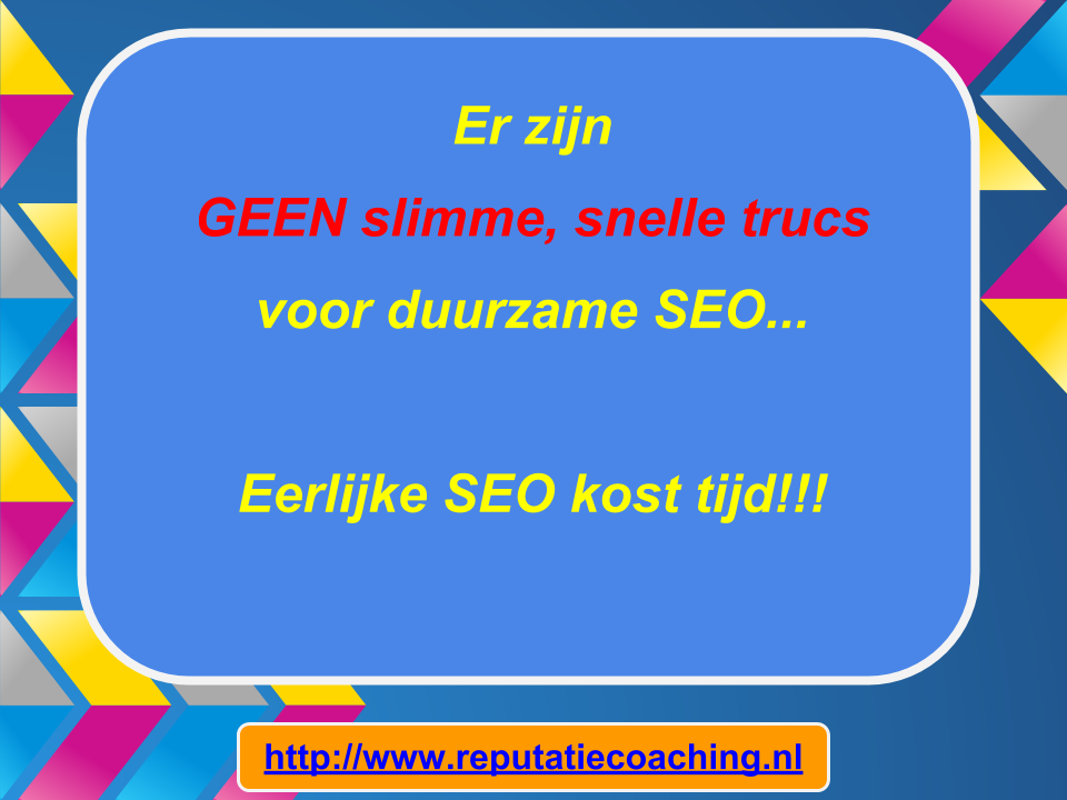 Samenvattend: lokale SEO kost tijd… Veel tijd. Je moet dus geen magische resultaten verwachten als je ergens een review krijgt of je bedrijf weer ergens in een site hebt aangemeld. Nogmaals: het kost tijd! Soms echt weken of zelfs maanden. Geef het dan ook die tijd en ga niet proberen slimmer te zijn dan “het systeem”. Dat werkt misschien eventjes, maar zal je op den duur echt lager in de resultaten brengen.
