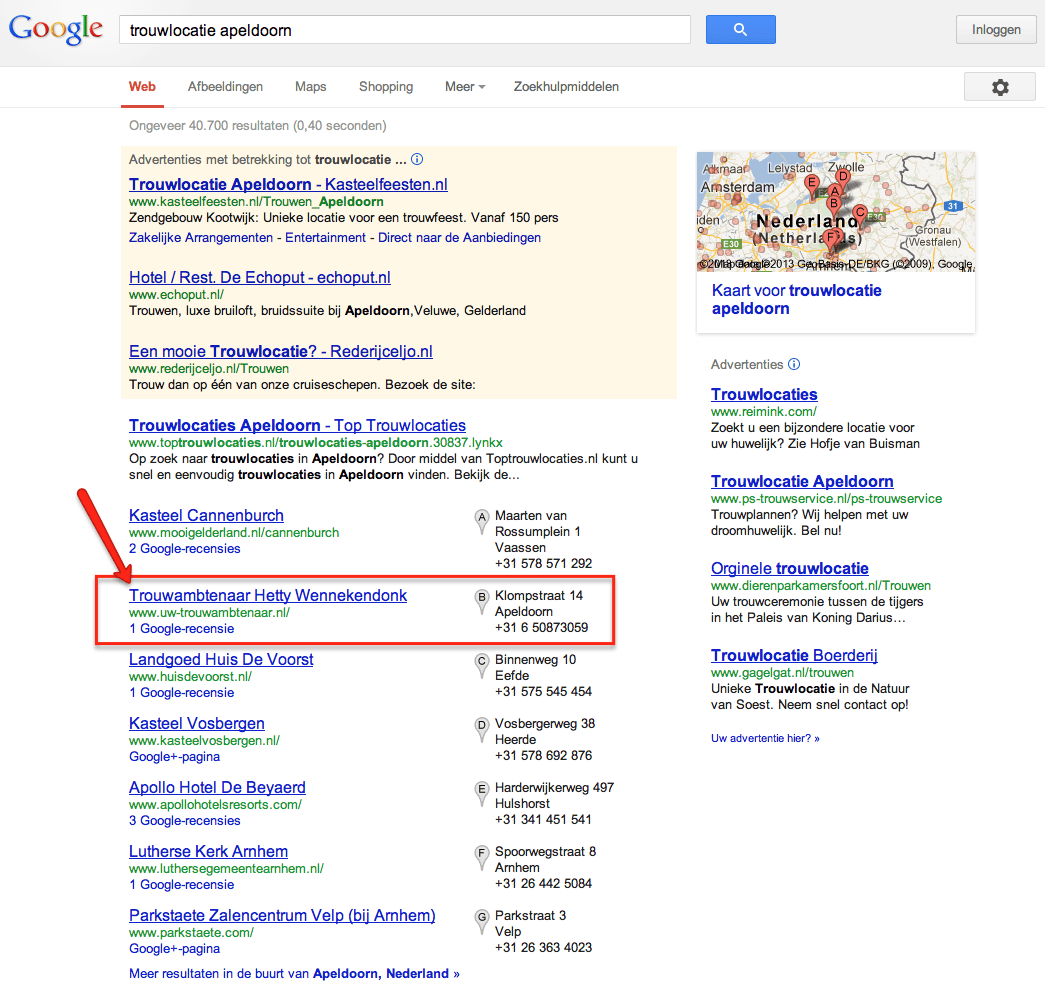 Maar afgelopen week was ik in Google aan het zoeken op de zoekterm “trouwlocatie Apeldoorn” en ik was hogelijk verbaasd dat ik de Google+ Local pagina van Hetty op de tweede positie zag staan. In de show notes zie je een screendump staan. Bij deze zoekpoging ben ik niet ingelogd en toch zie je hierop duidelijk dat zij als trouwambtenaar op de “B”-positie staat.