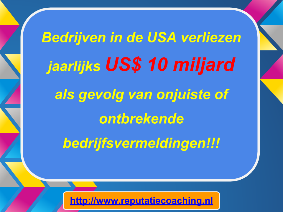 Wist je dat bedrijven in de Verenigde Staten jaarlijks meer dan 10 miljard Amerikaanse dollar mislopen doordat ze geen of onjuiste bedrijfsvermeldingen hebben? Het Amerikaanse bedrijf Yext heeft laten onderzoeken wat sommige bedrijven mislopen aan omzet als gevolg van onjuiste of onvolledige contactgegevens. Op Screenwerk.com las ik dit allemaal in een artikel. En dit bedrag kwam niet zomaar uit de lucht vallen.