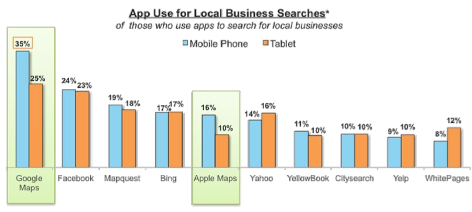 In 35% van de zoekpogingen wordt op een mobiele telefoon inderdaad Google Maps gebruikt. Facebook komt daar meteen achteraan met 24%. Apple Maps wordt echter maar in 16% van de gevallen gebruikt.