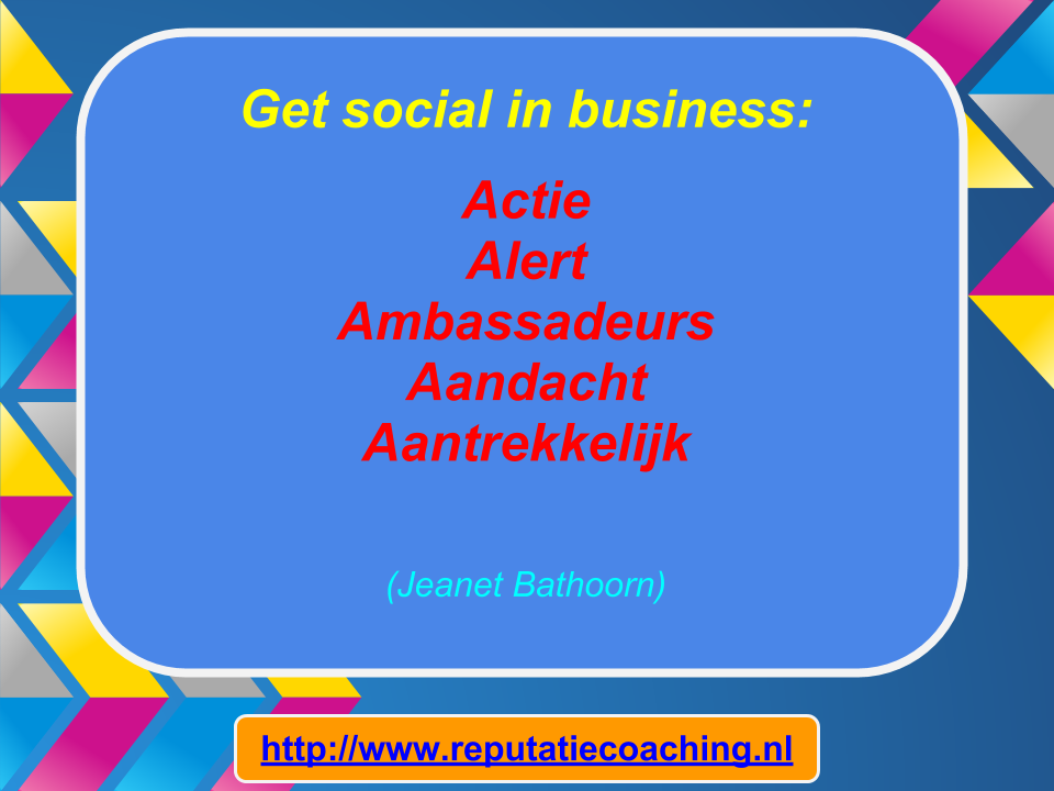 Maar al lezend liep ik vanmiddag tegen een leuk artikel aan op FrankWatching.nl. De titel van het artikel is: “De 5 A’s voor werkzoekenden: word een online persoonlijkheid” en het is geschreven door Jeanet Bathoorn. Jeanet is een social media expert, auteur, trainer en internationaal spreker. Ze is in januari met haar boek “Get social in business” ook genomineerd voor Managementboek van het jaar.