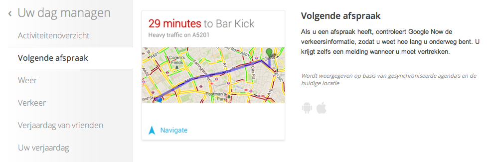 “Als u een afspraak heeft, controleert Google Now de verkeersinformatie, zodat u weet hoe lang u onderweg bent. U krijgt zelfs een melding wanneer u moet vertrekken.”