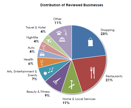 In de show notes heb ik een leuke grafiek van Search Engine Land geplaatst. In deze grafiek is te zien dat “Shopping” en “Restaurants” duidelijk het leeuwendeel zijn van Yelp. 23% van de bedrijven waarvoor reviews in Yelp zijn gepost zijn winkels en 21% van de reviews zijn voor restaurants.