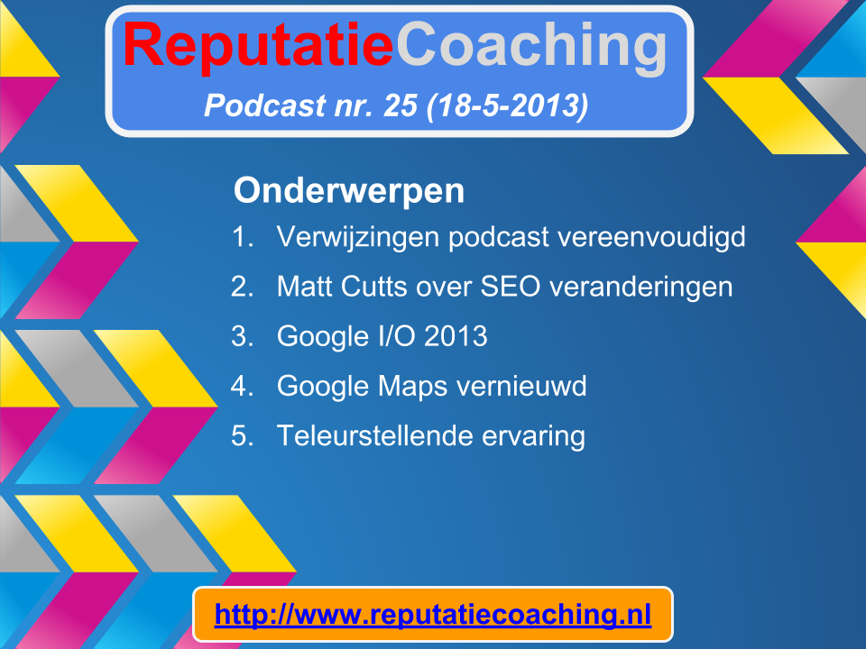 Vandaag begin ik eerst met een drietal nieuwtjes over de site en de content die ik bied. Matt Cutts, één van de kopstukken van Google, heeft aangekondigd wat we de komende maanden van Google op het gebied van SEO kunnen verwachten. Een stukje uit die video gaat over reputatie en autoriteit. En afgelopen week was in het Moscone Center in San Francisco de Google I/O 2013, waar ik het in de vorige podcast ook al over had. Daar heeft Google dus veel nieuws gepresenteerd, waarover ik je een paar dingen wil vertellen. Op Moederdag had ik zelf een teleurstellende ervaring in een restaurant: blijf luisteren om te horen hoe het is afgelopen... Mijn naam is Eduard de Boer –ook wel bekend als de ReputatieCoach– en ik ben je host voor vandaag!