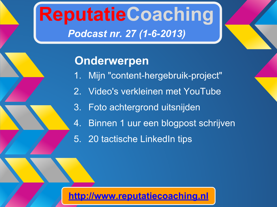 Gedurende afgelopen week heb ik zoals altijd weer een grote hoeveelheid informatie geconsumeerd. Om te beginnen kom ik vandaag nog even kort terug op het hergebruik van bestaande content, waar ik het in de vorige podcast al over had. Als tweede heb ik een nuttige tip voor je, hoe je snel een object uit een foto kunt knippen of beter gezegd: de achtergrond eraf kunt halen. Als derde: hoe frequent moet je bloggen, wil je jezelf echt op de kaart zetten en hoe kun je snel een blogbericht schrijven?