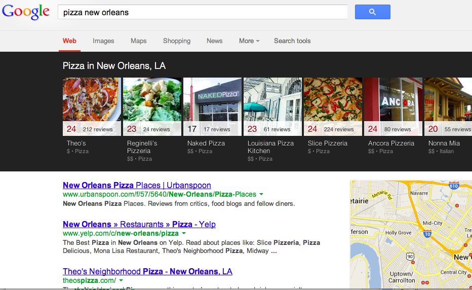In plaats dat de lokale resultaten worden getoond met de letters “A” tot en met “G”, wordt op dit moment in Amerika boven de organische zoekresultaten een balk getoond met daarin foto’s en de naam van de getoonde bedrijven, het aantal reviews en de Zagat score:!