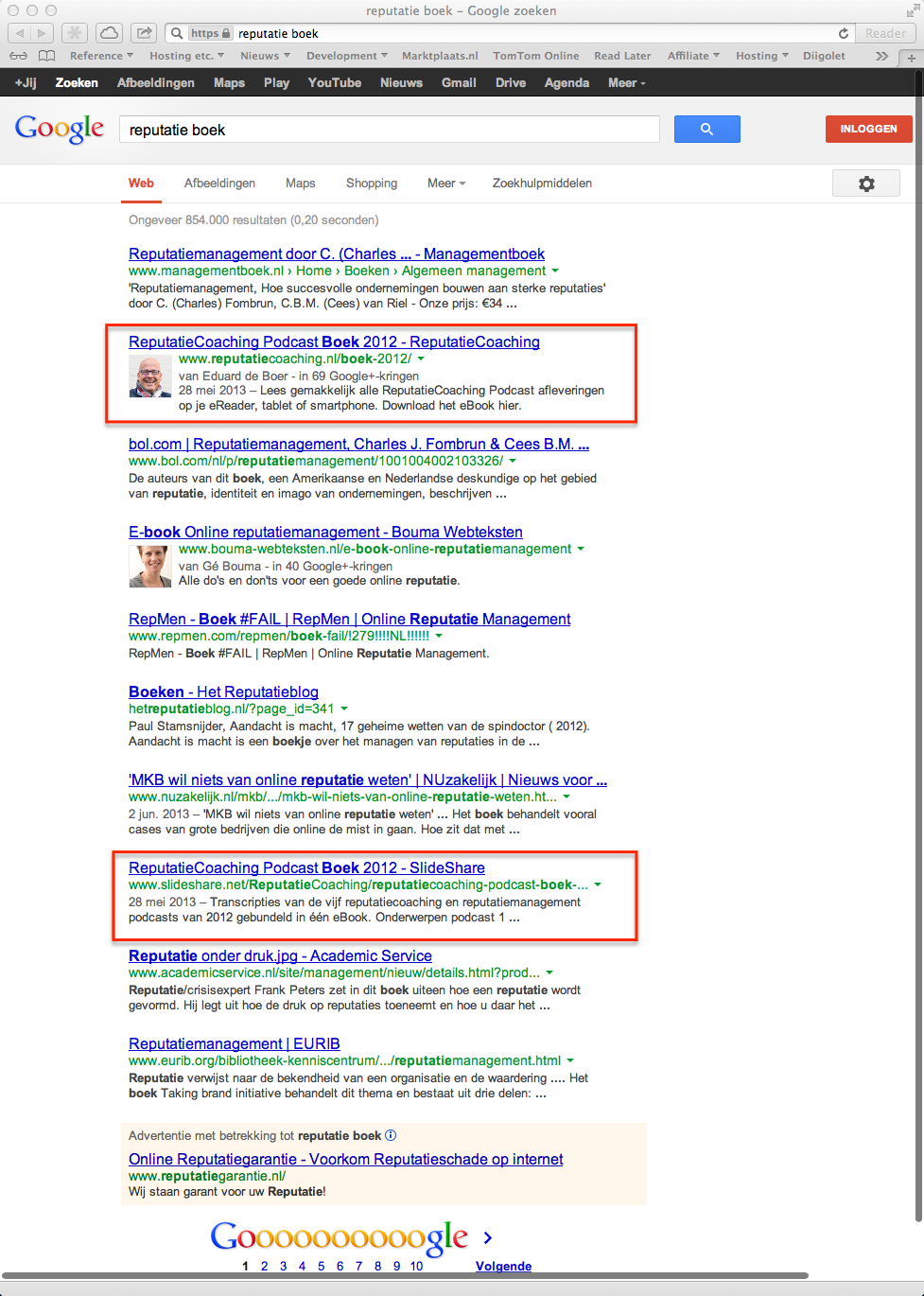 Doordat ik het boek heb geüpload naar Slideshare en de Slideshare versie ook nog eens toon op het weblogartikel over het boek van 2012, zie je dat ik dus met relatief weinig moeite op de gewenste zoektermen nu twee posities heb op de voorpagina, te weten: positie 2 en positie 8. Geen slecht resultaat als je nagaat dat ik helemaal niet veel moeite hiervoor heb hoeven doen. Overigens kunnen de resultaten bij jou iets verschillen, omdat Google de resultaten aanpast aan de zoekgeschiedenis van de gebruiker.