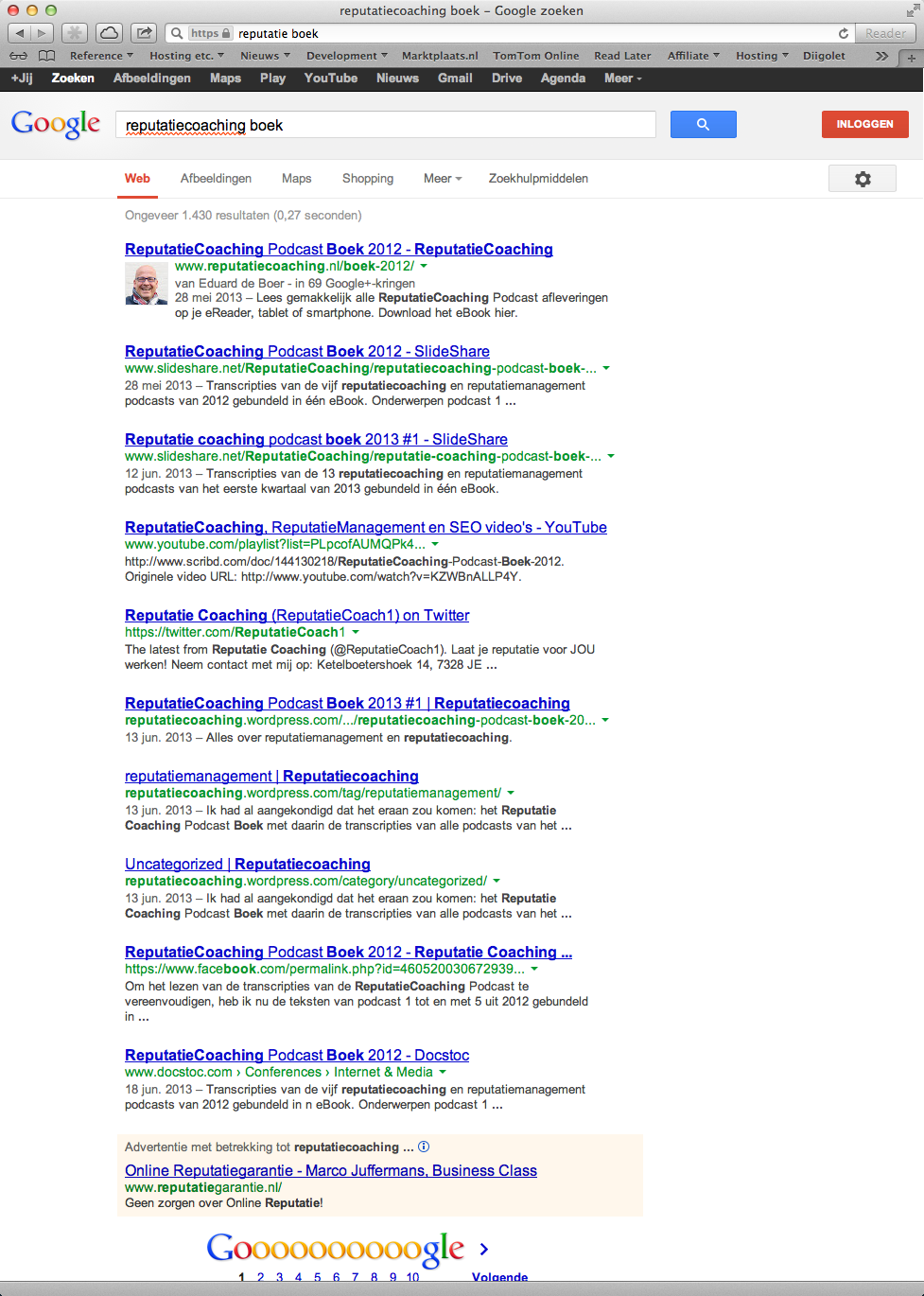 Ik heb het ReputatieCoaching Podcast Boek van 2012 en die van het eerste kwartaal van 2013 naar Slideshare geüpload. Die van 2012 staat er natuurlijk al iets langer… En als je nu op Google zoekt op de trefwoorden: