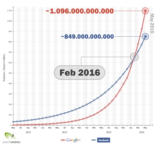 Op dit moment ligt het aantal gebruikers nog ver achter dat van Facebook, maar als je de statistieken extrapoleert, lijkt het erop, dat Google+ omstreeks februari 2016 Facebook voorbij zal streven.