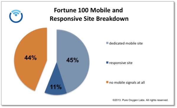 Maar op Search Engine Land las ik dat het bedrijf Pure Oxygen Labs een onderzoek heeft gedaan onder de Fortune 500 bedrijven om te zien in welke mate ze de aanwijzingen van Google goed opvolgen. Het bleek dat 44% van de bedrijven niet eens een specifieke mobiele website heeft en dat 45% wel een aparte mobiele site heeft. Slechts 11% van alle bedrijven gebruikt responsive technologie voor haar website.