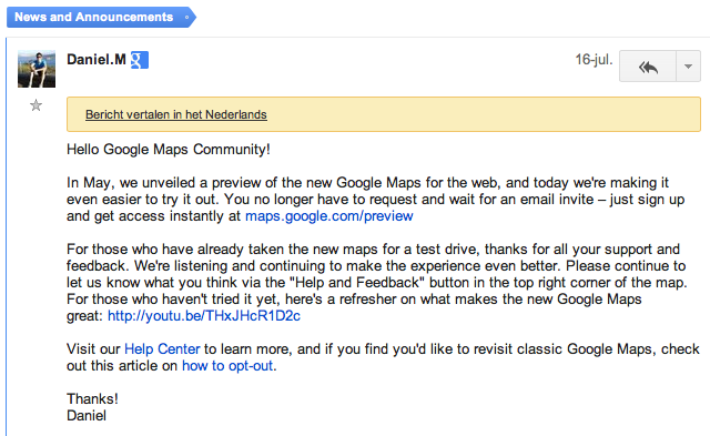 - “Get access to the new Google Maps — No invite necessary!” (Google Groepen, 16 juli 2013)