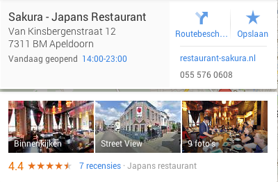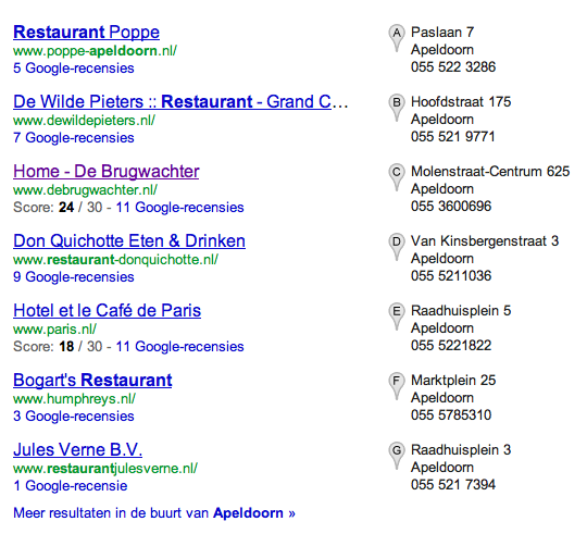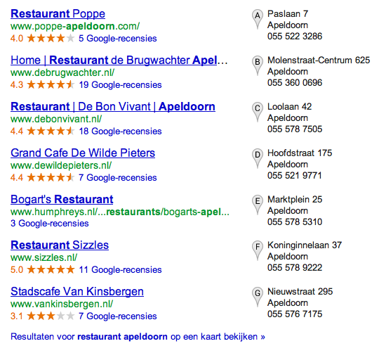 Mochten de sterretjes nog niet bij jouw bedrijfsvermelding op Google+ Lokaal worden vertoond, dan heb je waarschijnlijk nog geen vijf reviews. Want als je minstens vijf reviews hebt, worden de sterretjes getoond. In de show notes heb ik ook een screenshot opgenomen van de zoekterm “restaurant Apeldoorn” die ik meteen vrijdagmorgen heb gemaakt: