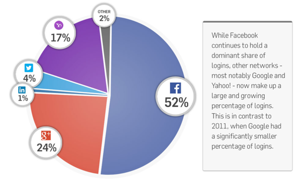Het bedrijf Gygia is een social login provider en houdt allerhande social media gegevens bij. Zij rapporteerden dat in het tweede kwartaal van 2013 Facebook in 52% van alle gevallen werd gebruikt. Google was tweede met 25% en Yahoo! kwam op de derde plaats met een respectabele 17%.