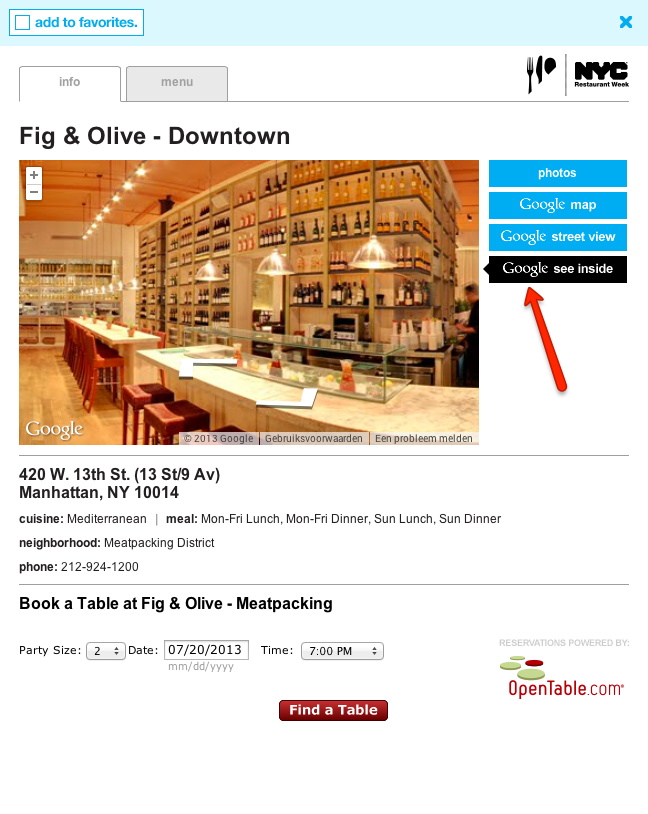 Dit wordt ook nog eens geïllustreerd door de website van het evenement. Deze kun je vinden op www.nycgo.com/restaurantweek. Op deze site worden de deelnemende restaurants vertoond en je kunt er ook meteen een tafel boeken. Maar om het punt van het toenemend belang van de Google Bedrijfspanoramas te onderstrepen, heb ik een screenshot van een restaurant op die site opgenomen in de show notes: