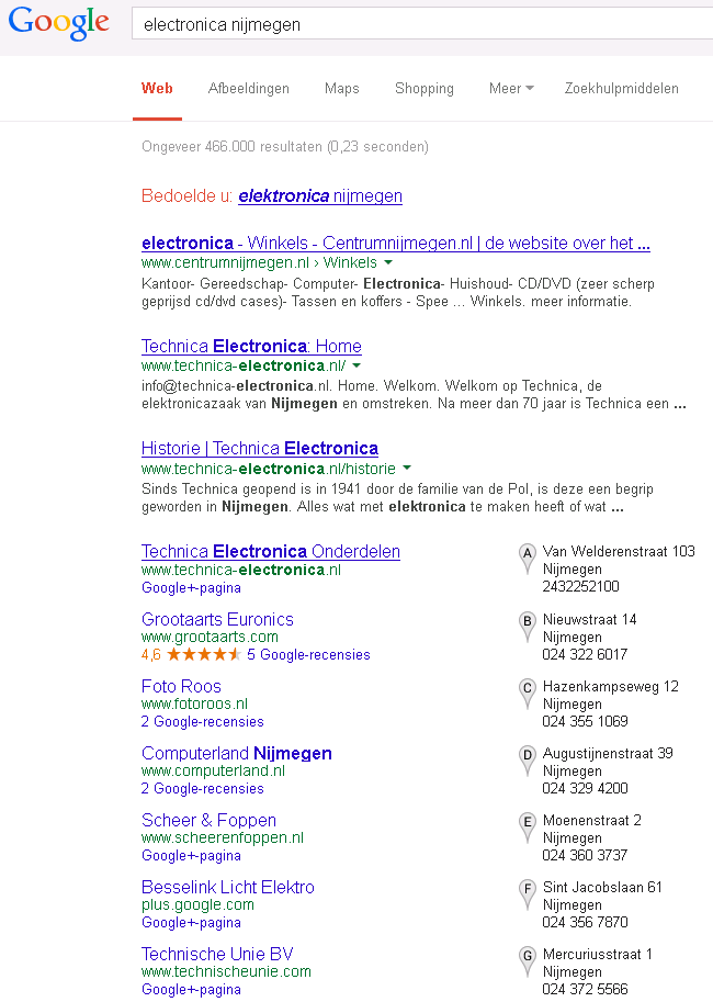 Helaas heb ik voor jij begon geen research gedaan om te zien hoe jouw zaak scoorde in de lokale zoekresultaten, op bijvoorbeeld “electronica Nijmegen”. Heb jij dit toevallig in het verleden bekeken?
