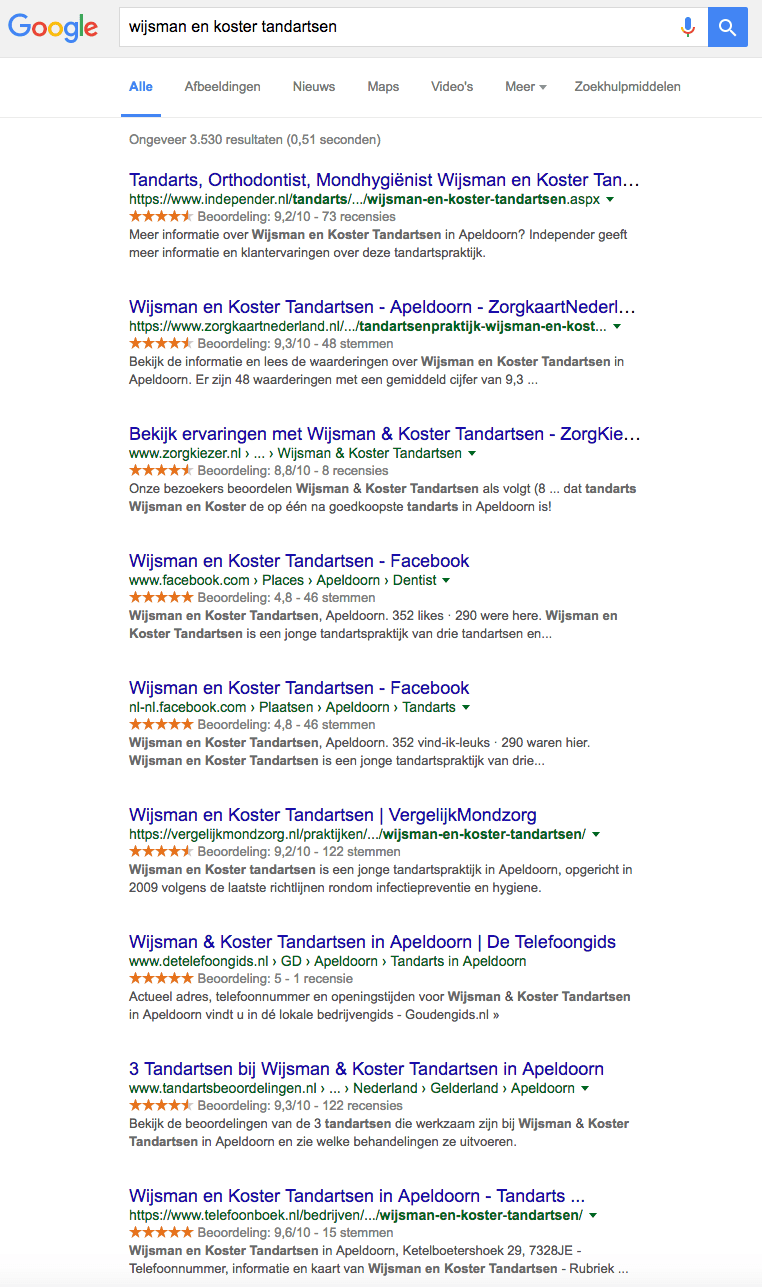 Door niet alleen op bekende sites reviews te verzamelen, krijg je nog meer social proof bij een zogenaamde “branded search”, een zoekopdracht op de naam van een bedrijf, (bijvoorbeeld Wijsman en Koster Tandartsen):