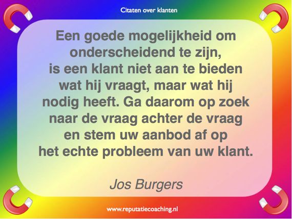 Een goede mogelijkheid om onderscheidend te zijn, is een klant niet aan te bieden wat hij vraagt, maar wat hij nodig heeft. Ga daartoe op zoek naar de vraag achter de vraag en stem uw aanbod af op het echte probleem van uw klant. Jos Burgers