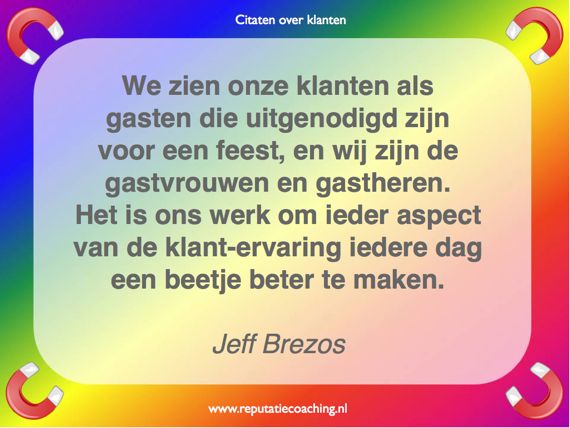 We zien onze klanten als gasten die uitgenodigd zijn voor een feest, en wij zijn de gastvrouwen en gastheren. Het is onze werk om ieder aspect van de klant-ervaring iedere dag een beetje beter te maken. Jeff Brezos