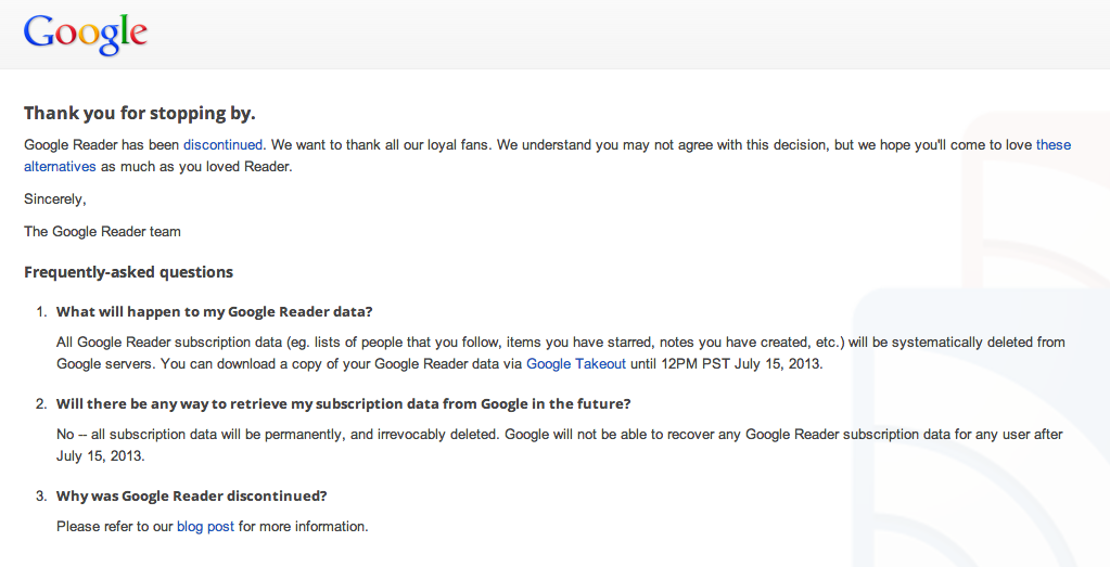 Google kondigde al ongeveer een half jaar aan, dat ze haar dienst Google Reader per 1 juli zou opheffen. Gisteren (1 juli) kon ik de site nog benaderen, maar vandaag was die echt opgeheven.