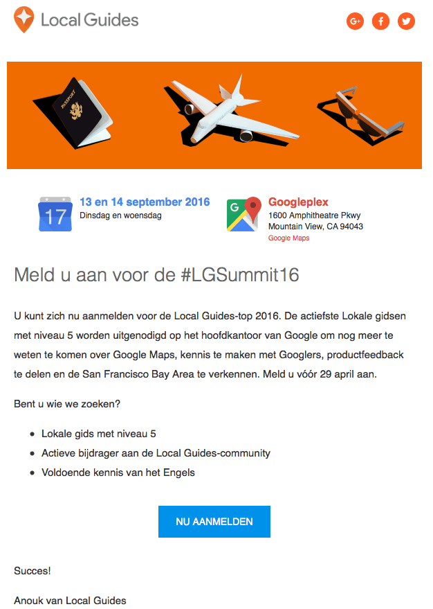In september organiseert Google in San Francisco de eerste Summit voor Lokale Gidsen. Daarvoor worden alleen actieve gidsen van niveau 5 uitgenodigd. Google betaalt dan alles, zowel de reis als het verblijf. Ik ga me aanmelden!