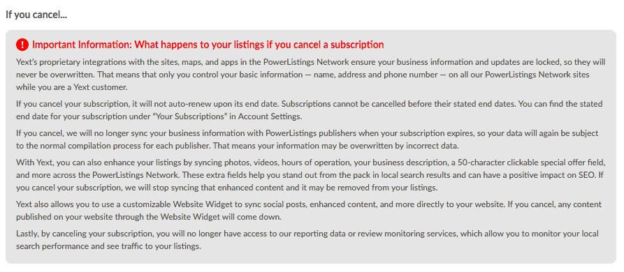 Maar als je stop met het gebruik van Yext, dan ben je in de aap gelogeerd. Yext schrijft hier het volgende over: